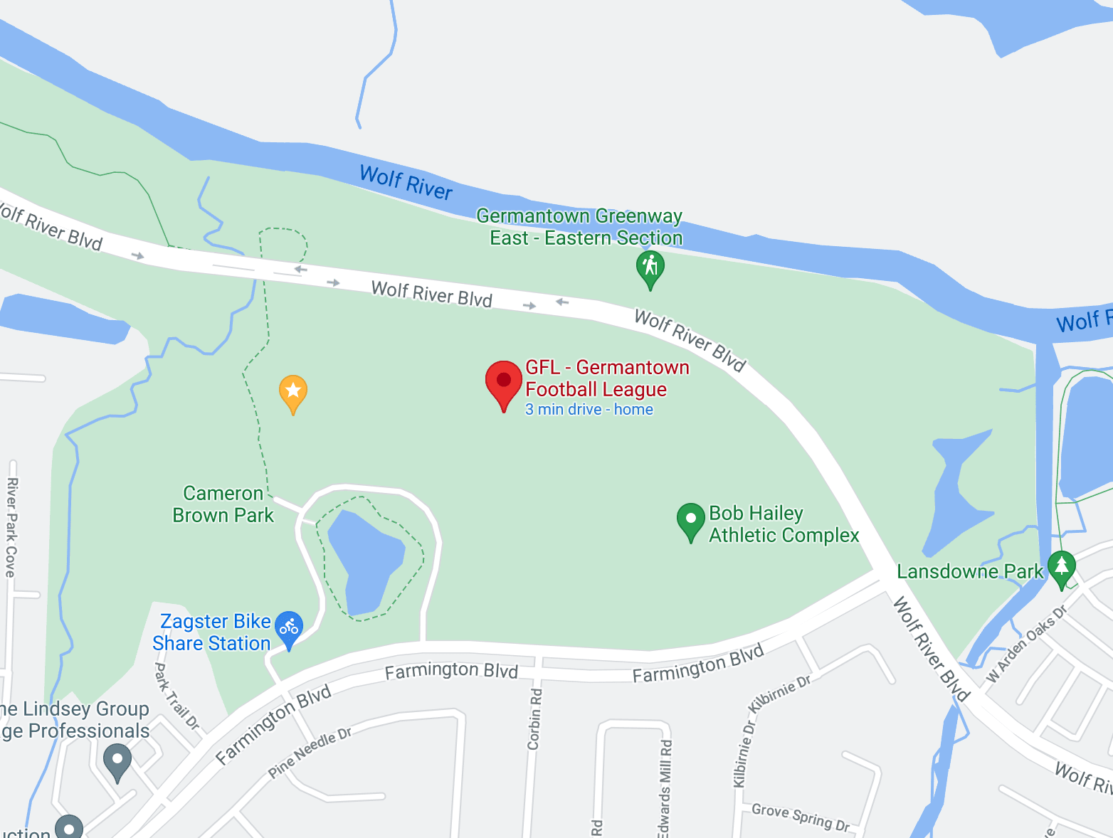 Our football game fields are located in between Bob Hailey Athletic Complex and Cameron Brown Park. The address of Bob Hailey is 8750 Farmington Blvd, which is at the corner of Farmington Blvd. and Wolf River Blvd. in Germantown. Teams will be assigned a practice location either in Cameron Brown or Bob Hailey and remain there throughout the season and all games will be played on site.